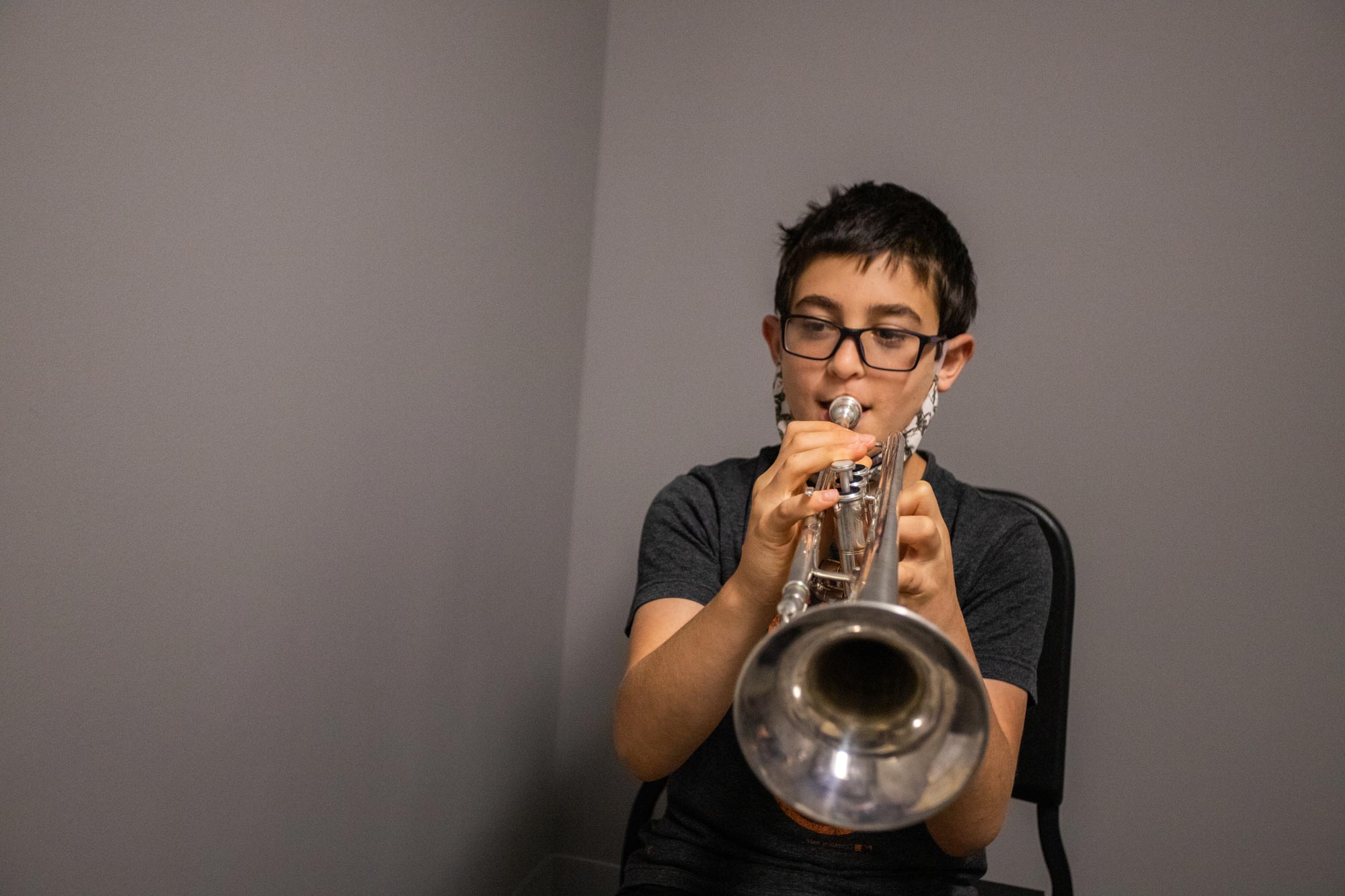 Because of the size and demands of playing the trumpet, we recommend that students be at least 8 years old before starting trumpet lessons. Basics, including buzzing on the mouthpiece, partials and overtones, breath control, music reading, posture, and more are introduced to new students. Intermediate and advanced students focus on improving repertoire and technique, including breath control and support, posture, tonal quality, finger dexterity, articulation, and hand position.